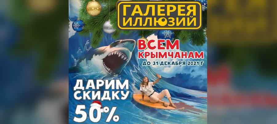Галерея иллюзий – самый большой арт-объект подобного рода на территории Крыма и всего юга России дарит всем крымчанам новогодний подарок. Это 50%-ная скидка на посещение Галереи иллюзий в течение всех предпраздничных дней, до 31 декабря включительно.